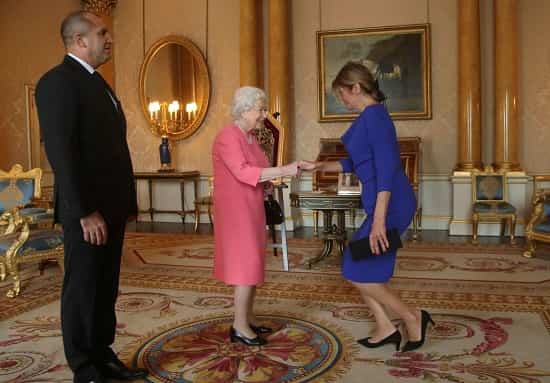 Президентската съпруга използва комбиниран поздрав на срещата с кралската особа. Тя се здрависа с обитателката на Бъкингамския дворец и същевременно направи реверанс, както се очаква от дамите, които се срещат с Елизабет II. Този тип поздравяване е много любим на британската министър-председателка Тереза Мей. Тя винаги използва тази комбинирана техника при среща с главата на монархията.