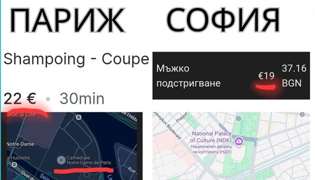 Фризьорски салон с висок рейтинг в центъра на Париж, буквално до Парижката Света Богородица, мъжка подстрижка: 22 евро. Фризьорски салон в София, мъжка подстрижка: 19 евро.