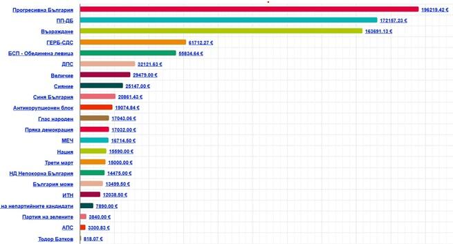 На второ място са от „Продължаваме промяната – Демократична България“ – 172 157 евро. ПП-ДБ водеше 10 дни по-рано.