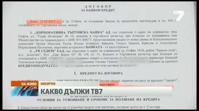 Каква е истината за задълженията на телевизията по този заем? Договорът за кредит, който TV7 взима от КТБ, е подписан на 15 февруари 2013 г. от тогавашния изпълнителен директор Десислава Тошева. Сумата, който тегли телевизията е 1,3 млн. евро (2,54 млн. лв.), което е далеч под 10 млн., за които вчера беше споменато. Парите са за купуване и инсталиране на телевизионна техника.
