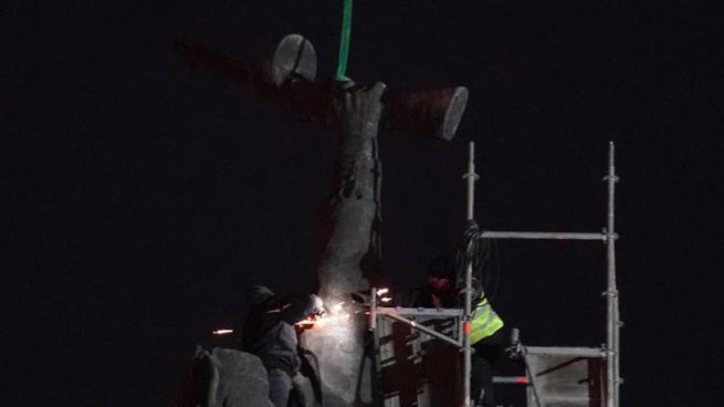 С кран демонтират фигурите на Паметника на съветската армия. Около 18.00 ч. започна рязането с флекс на най-високата фигура на монумента, предаде БНТ.