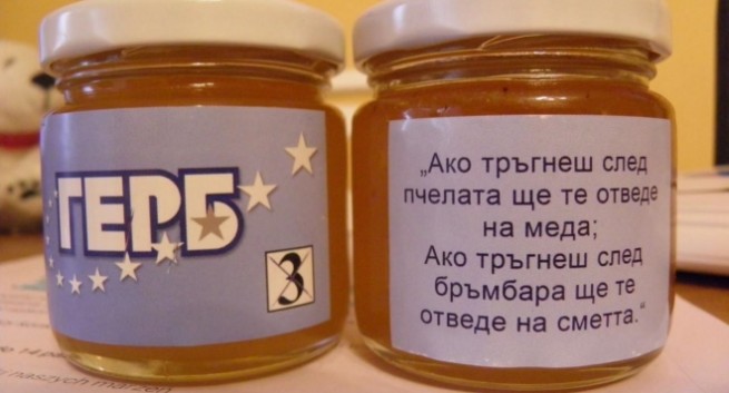 „Ако тръгнеш след пчелата ще те отведе на меда, ако тръгнеш след бръмбара ще те отведе на сметта“. Това гласи предизборният етикет на сладкия продукт. От другата страна на бурканчетата с мед се кипри логото на ГЕРБ и номерът на бюлетината им.