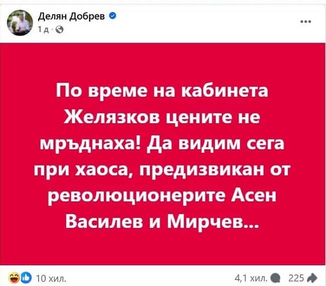 Депутатът от ГЕРБ Делян Добрев разбуни духовете във Фейсбук с изумителна публикация. На огнено червен фон Добрев е написал с бели букви следното: „По време на кабинета Желязков цените не мръднаха. Да видим сега при хаоса, предизвикан от ревюлюционерите Асен Василев и Мирчев…“.