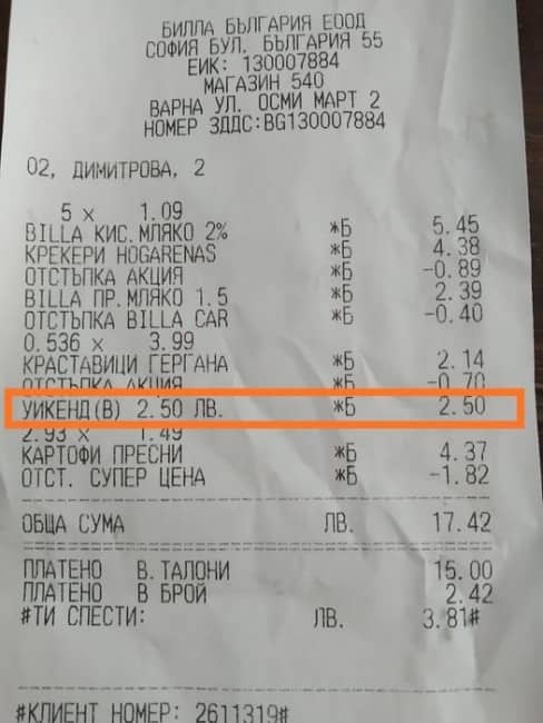 „След съботното пазаруване установих, че в „Билла“ има такса уикенд на цена 2.50 лв.“, така жената е озаглавила следния кадър и го е качила в социалната мрежа. От касовата бележка става ясно, че това не е никаква такса, а вестник „Уикенд“. Това естествено предизвика много реакции в мрежата. Ето какво пишат хората: