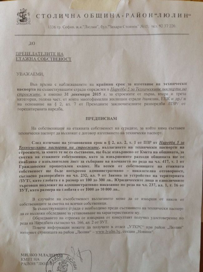 Той е адресиран „до преЦедателите на етажна собственост. Предписанието е подписано и подпечатано от кмета на района Милко Младенов.