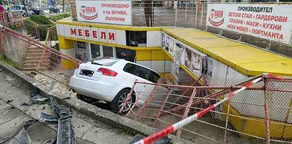 Кола се вряза в подлез с магазини в центъра на Шумен след катастрофа между два автомобила, съобщиха от полицията.