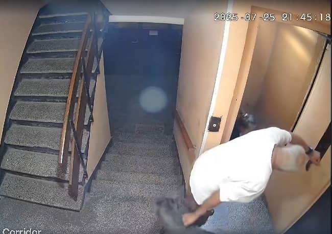 Малкото куче бе със своята млада собственичка. Те тъкмо излизаха от асансьора. За нещастие точно в този момент се появи масивното куче (по всичко изглежда питбул) на възрастен мъж.