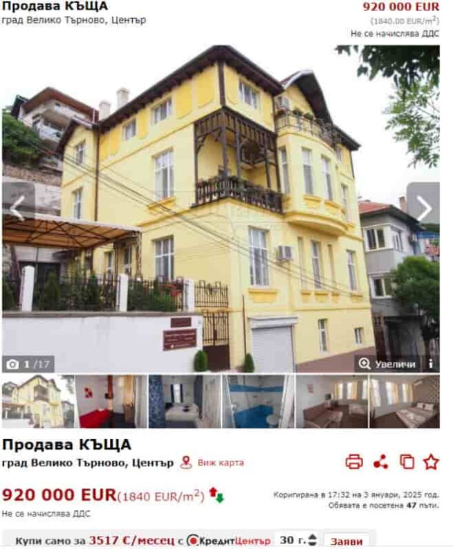 ПАЗАРЪТ НА ИМОТИ В ОБЛАСТНИЯ ГРАД ОСЪМНА С ЕКСКЛУЗИВНА ОФЕРТА ЗА КЪЩА С ГРЕДОРЕД ЗА КОЛОСАЛНАТА ЦЕНА ОТ 920 000 ЕВРО. Зданието поставя нов рекорд по скъпотия във Велико Търново и буди недоумение сред потенциалните купувачи, пише местният вестник „Борба“.