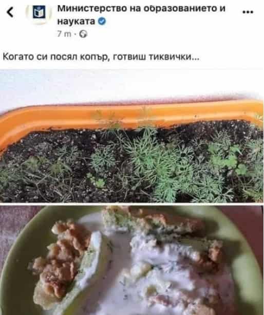 „Когато си посял копър, готвиш тиквички…“, гласи написаното. Под него се виждаха две снимки – на свеж копър в саксия и на ястие, подправено с копър.