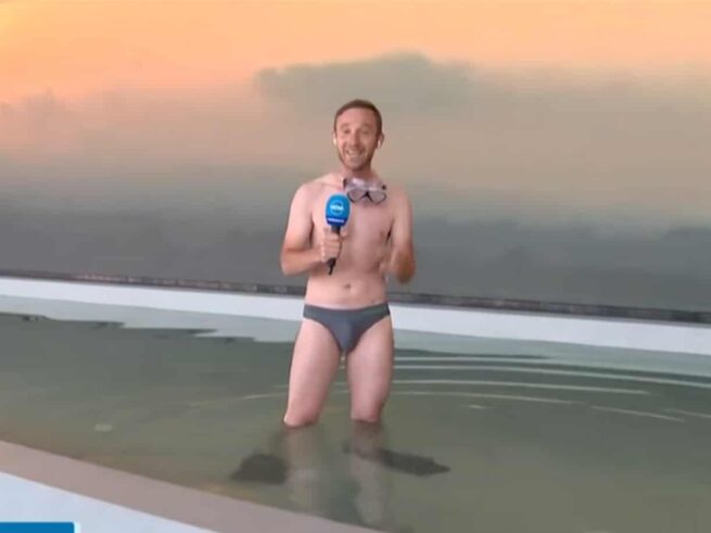 Синоптикът на Нова телевизия Ники Василковски е известен с нетрадиционните си появявания в ефир, с които илюстрира прогнозите си. Навръх 30-ия рожден ден на телевизията обаче той леко мина границата на добрия вкус, след като се появи по плувки пред новата сграда на медията. Василковски беше обул и правници и смело е потопи във водното огледало пред входа на Нова, пише Блиц.