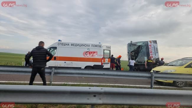 Съобщението за инцидента е получено около 17:17 часа. Вероятната причина е заспиване на 45-годишния водач – автобусът първоначално се е блъснал в крайпътен билборд, а после се е обърнал в крайпътната канавка, посочват от ОДМВР-Бургас.