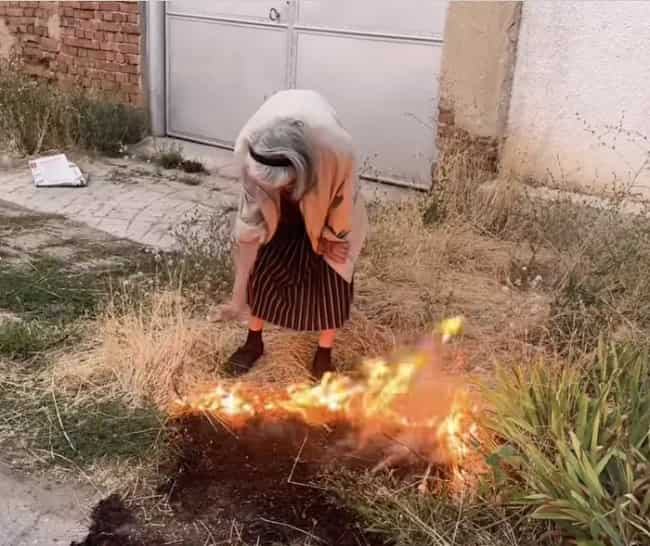 На фона на нестихващите пожари, като този от Пирин, който въпреки дългочакания дъжд, отново се разпали, в социалните мрежи се появи видеоклип, показващ възрастна жена до малко активно огнище, обхванало сухи треви на тротоар в Ихтиман.