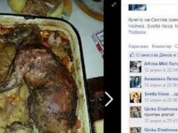 Малкото кученце е положено в тава, а около него има картофи и моркови. „Много е вкусно, скоро ще снимаме остатъците“, пише Анджелика Петкова, като уточнява, че това е домашният любимец на приятелката й Светла Илиева. Запознати коментират, че това не е първият подобен случай за бургазлийките, тъй като преди време отново са яли месо от малки и беззащитни кученца.