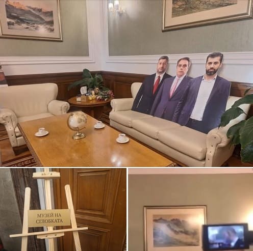 Вчера Пеевски „покани“ парламентарните журналисти в преобразения си кабинет. По диваните има картонени макети на бивши и настоящи председатели на ПП-ДБ, подписани от ГЕРБ, ДПС и обединението законопроекти, големи пана, на които се виждат предполагаеми съобщения между Кирил Петков и Пеевски. Музеят си има и уредничка. Не е ясно къде е новият кабинет на лидера на ДПС-НН.