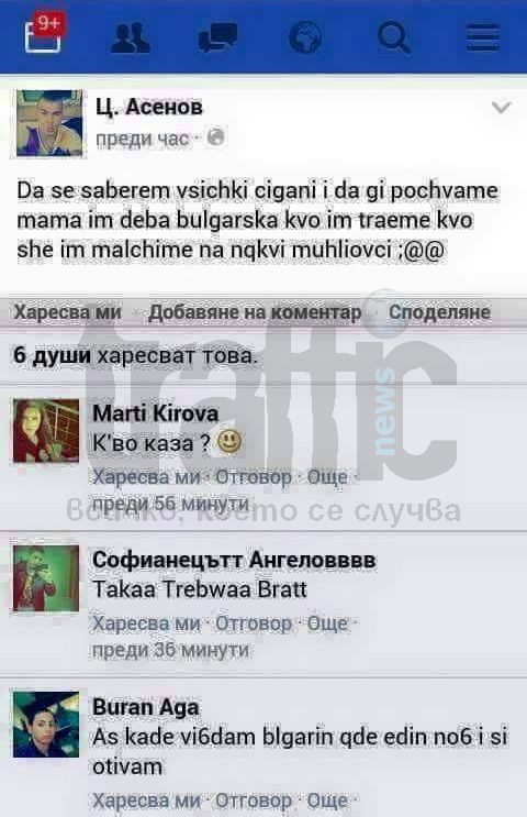 „Да се съберем всички цигани и да ги почваме, мамка им българска, к’во им траеме, к’во ще им мълчим на някакви мухльовци”, пише във Фейсбук момче, явно от цигански произход, с име Ц. Асенов.