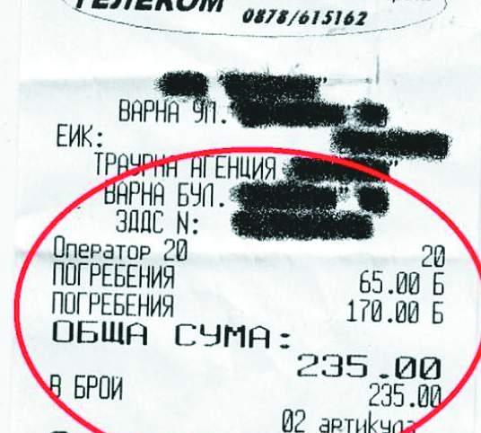Стефанов се закани да алармира за случая Комисията за защита на потребителите (КЗП) и МЗ. Това са пълни глупости. Как ще оставим тялото на паркинг! Прибрахме покойника от болницата, преоблякохме го с донесените от близките дрехи, съхранихме го в хладилна камера. Уговорката със семейството беше, че те ще дойдат в офиса на следващия ден около 9 часа да се разплатят, а ние в 11 часа ще транспортираме покойника до дома им. Така и не дойдоха в уречения час. Пристигнаха чак след 11,30 часа, както е видно и от самия касов бон, който сме им издали. След като платиха услугите, които са ползвали, тялото беше транспортирано до посочения от близките адрес. Въобще не виждам защо трябва да обясняваме тарифите си. Предоставили сме определени услуги, които си имат съответни цени”, коментира собственикът на траурната агенция.