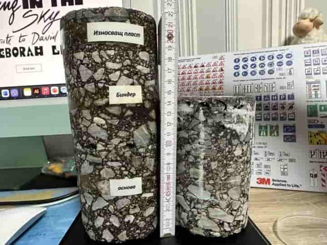 “Конкретната ядка, която се взима от асфалтовата настилка, ни показва съответните пластове. Вземането на пробите е избираем. Спрямо проектната документация ние имаме заложена определена дебелина на пластовата настилка. След изваждането на тази ядка се прави съпоставка”, каза Ангелов.