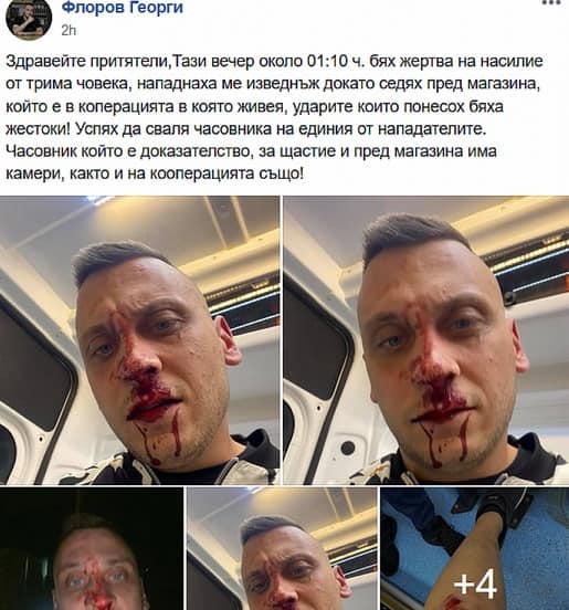 „Здравейте притятели,Тази вечер около 01:10 ч. бях жертва на насилие от трима човека, нападнаха ме изведнъж докато седях пред магазина, който е в коперацията в която живея, ударите които понесох бяха жестоки! Успях да сваля часовника на единия от нападателите. Часовник който е доказателство, за щастие и пред магазина има камери, както и на кооперацията също!“, написа Флоров във фейсбук.