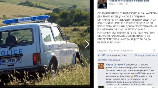 „СКЪПИ ПРИЯТЕЛИ ВЪВ ВЪЛЧЕДРЪМ СА НАМЕРЕНИ ДВА ТРУПА НА ДЕЦА НА ПО 3 4 ГОДИНКИ ОРГАНИТЕ ИМ СА ИЗВАДЕНИ И ВЗЕТИ ДЕЦАТА СА ЗАШИТИ И ХВЪРЛЕНИ В РЕКАТА ДЕЦАТА СА ОТ ЧЕРНИ ВРЪХ МОЯ НАЙ – ДОБРА ПРИЯТЕЛКА СЪЩО Е ИЗЧЕЗНАЛА ОТ СНОЩИ ТЕЛЕФОНА И Е ИЗКЛЮЧЕН! МОЛЯ ВИ ПАЗЕТЕ СЕ ТЕЗИ КРЕТЕНИ ОБИКАЛЯТ НАВСЯКАДЕ МОЛЯ ВИ ПАЗЕТЕ СЕ СПОДЕЛЕТЕ ТОВА НА СТРАНИЦИТЕ ВИ ЗА ДА РАЗБЕРАТ ВСИЧКИ !“