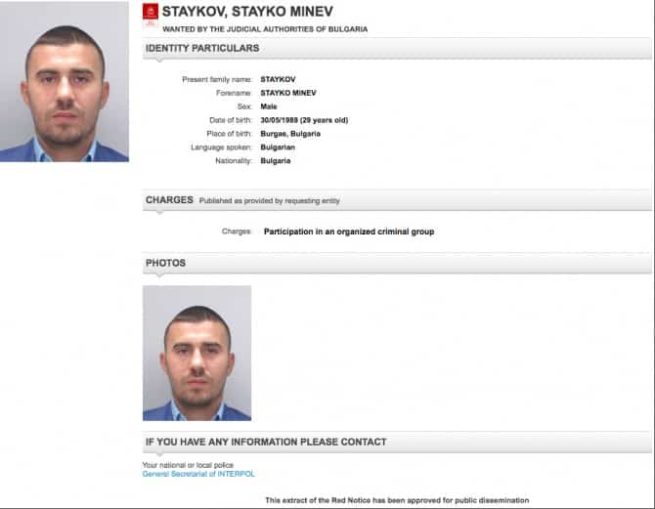 Според прокуратурата в бандата влизат Миню Стайков, шуреят му Белун Хазърбасанов, синът на кмета на Карнобат Иван Димитров и други 4-има. Стайко Стайков се издирва по света и у нас от началото на септември, когато от Специализираната прокуратура обявиха, че баща му е арестуван. Сега снимката му е пусната в публичния сайт на международната полицейска организация.