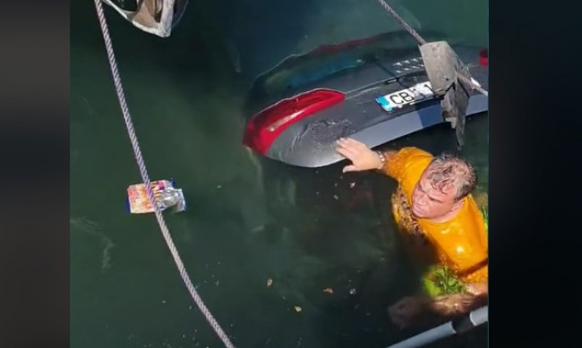 Инцидентът е от Кавала, а на кадрите може да се види Ауди със софийска регистрация, което е паднало във водата между лодките.