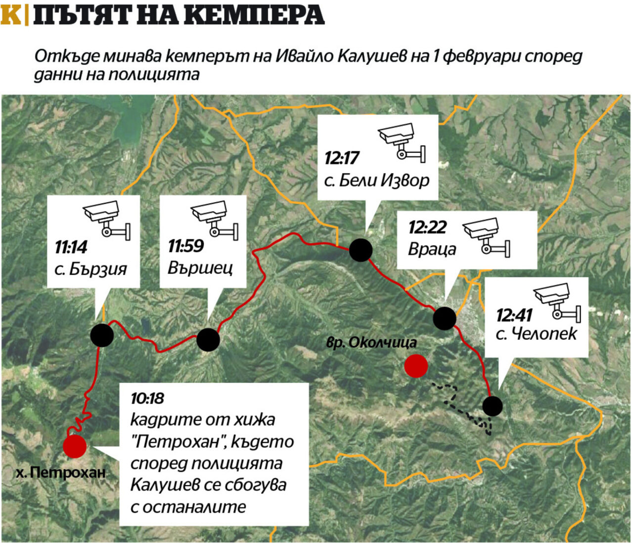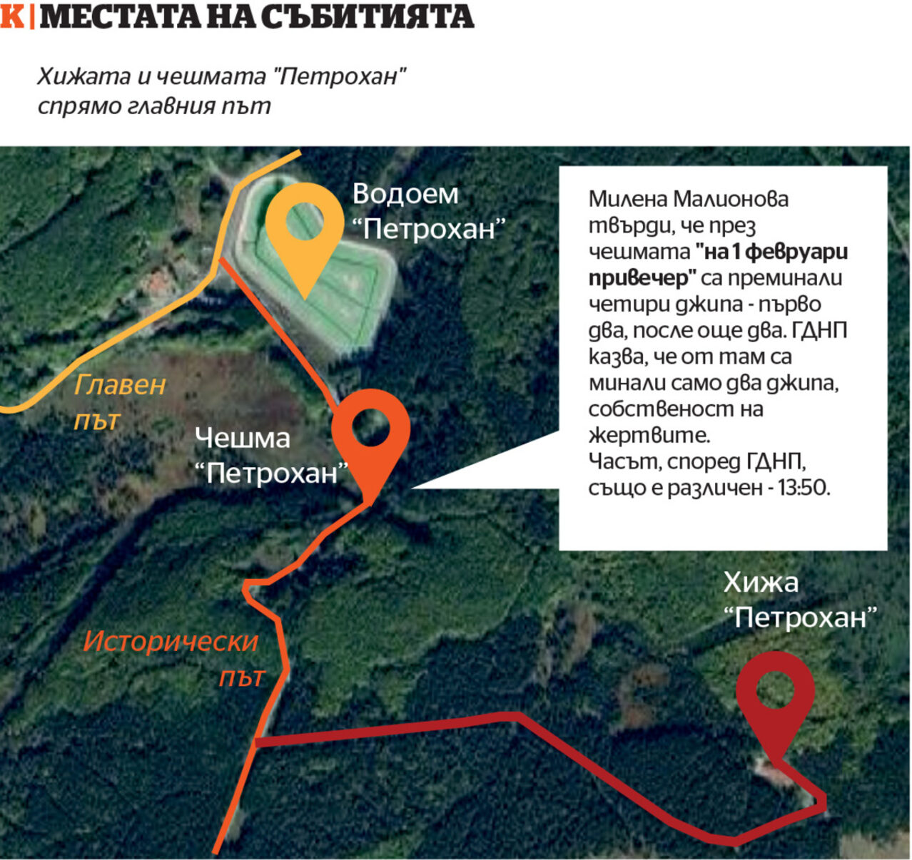 Първо е видян туарегът. „Стигайки точно на кръстовището, видях, че там току-що спира един черен джип марка „Фолксваген“, модел „Туарег“, на който не обърнах внимание за регистрационния му номер. Беше си изцапан джипът, като цяло, поради атмосферните условия. Понеже се занимавам с офроуд, му загледах гумите и видях, че не са за офроуд“, разказва свидетелят. Той описва как е спрял до джипа и шофьорът е свалил стъклото на шофьорската врата. В него имало двама души, мъже на възраст между 40 и 48 г. Поздравили са се и той им казал, че пътят по-нататък е непроходим, като ги е предупредил, че може да затънат в снега. „Изглеждаха като туристи, които вероятно искаха да пробват зимните си гуми“, предполага в разпита мъжът.