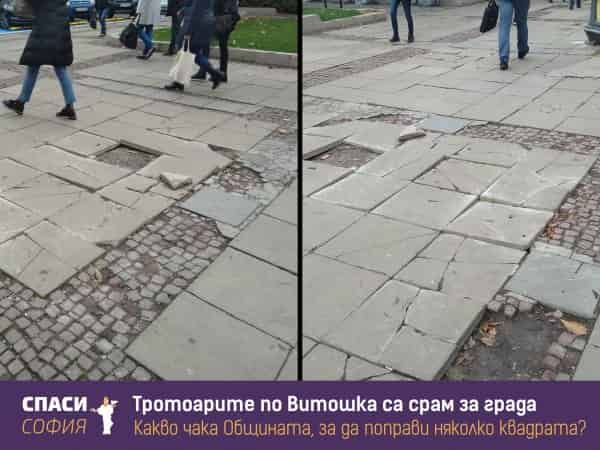 Тротоарите по булевард „Витоша“ между църквата „Света Неделя“ и Съдебната палата са срам за всяка европейска столица, написа гражданската организация „Спаси София“ във „Фейсбук“.