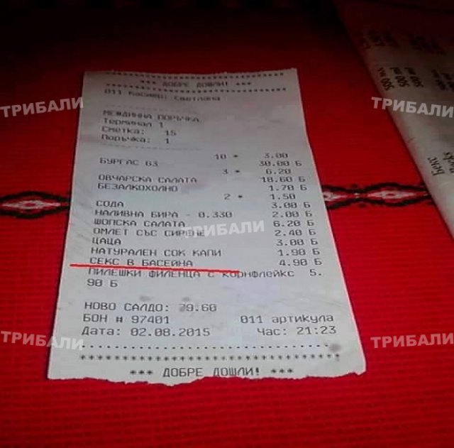 Касова бележа за изконсумиран „секс в басейн“ на стойност 4,90 лева разтърси социалните мрежи. Предполага се заради евтинията. От разпространената снимка ясно се вижда, че освен бургаска ракия, овчарска салата, цаца и други, клиенти на заведение са таксувани – значи употребили, и за „секс в басейн“.