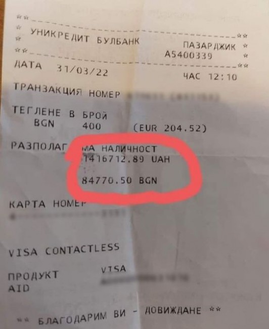 Забравена бележка от банкомат раздели мрежата на две. Намерена е до Здравната каса в Пазарджик, става ясно от публикация във Фейсбук. Това, което накара хората в мрежата да „скочат“ и да се скарат, е разполагаемата сума, която възлиза на 84 770.50 лв. Всъщност освен в български лева сумата е изписана и в украински гривни (1 416 712.89 UAH), което кара хората да си мислят, че сметката е на украинец.