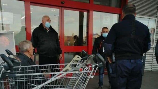 „АБСУРДНИТЕ ЗАПОВЕДИ! ТОВА БЕЗУМИЕ ТРЯБВА ДА СПРЕ!!! Пред Кауфланд(Кюстендил)! Възрастен човек с патерици не е бил допуснат от охраната да пазарува въпреки молбите му, че муе сложно да се върне и да идва пак, хвърли патериците падна и каза, че какво като се зарази на него и без това не му остава много! Извикаха и полиция заради,, престъпника“! Е така умират хората, а не от ковид!“ – пише авторът на снимките.